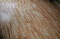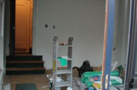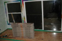 This is the west wall: the blue bar is the edge of the doorwall (the photo is shot from the deck, to which the doorwall leads.) Here you see we've removed the carpet (that green patch is a scrap) and purchased the green foam underlayment and ‘taptite’ flooring. Ideally, flameworking studios have noncombustable floors, but I felt wood would be acceptably safe; but I knew it would get burned so we got this manufactured stuff, which is quite a bit easier and cheaper to install than traditiontal 3/4” 2-1/4” wide oak. That's not to say the wizard didn't indulge in a great deal of swearing and use of a heavy sledge to pound the interlocking flooring together. (The ads show some dainty thing gently tapping it. I know someone else who also installed this sort of flooring, and they too resorted to a sledge. Worse, they installed in winter, and once they heated the room to 85–90—essential for their yoga studio—it buckled. Word to the wise: follow the directions about acclimating this stuff to the letter.) In any case floating wood flooring requires much less in the way of support than tile or poured concrete, not to mention being warmer, and easier on dropped beads, rods and tools.