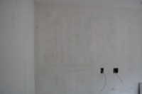 After repairing the sheetrock as best I could, I primed it. (We're back to that north facing wall.) The wizard, meanwhile, added a 20 and amp circuit for the kiln and a 4 recepticle 15 amp circuit various odds'n’ends (e.g. flexible shaft machine, radio). That, along with the three other duplexes scattered around the room, is proving to be enough wiring, at least for now.