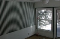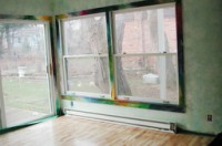 The prior owner was very proud of this room, particularly the Eastern Michigan University themed green and white striped wallpaper. I think he actually was hoping I'd keep it, so naturally it was the first thing I removed. The stripes are on the north facing wall, which is windowless, presumeably it faces the neighbor's carport. (The neighborhood predates modern setback laws.) The window and slice of doorwall face east, looking out into the back yard.
