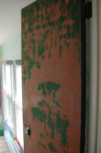 The dark green color this door was painted just absolutely sopped up the light in the little hallway from the kitchen to garage and studio, so I decided to repaint. Because latex was put directly over oil, it didn't stick very well, so I had to remove a lot of the paint using a vibratory palm sander. Joy. This was practically the last thing I painted, and for sheer technique, is my favorite, though it's in the green and pink scheme to match the kitchen.