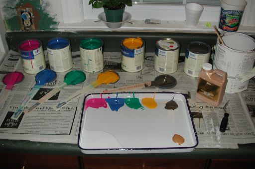 Although originally I got little quart cans of colors I thought I'd like—pale green, lilac, pink—it soon dawned on me that what I really wanted was the latex analog of my artist's acrylics, which I've used to paint things like chairs. Back to the DIY, this time to get the closest thing to saturated colors they'd sell me. The guy even let me look at the resevoirs, and I selected the following: