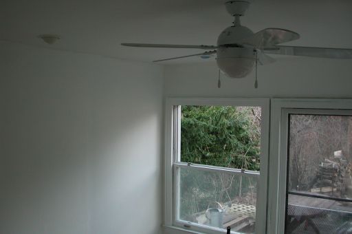 As you can see, paint is mostly a matter of white with just a bit of color. I initially tried various tools for applying color—a ‘seasponge’ roller, and a foam roller with a wave pattern—but soon discovered I preferred a lambswool roller with 1-1/2” (4cm) long fleece. This came in a ‘faux painting’ kit with a split tray, which I quickly dispensed with. The break in the roller to accommodate the silly tray is actually something I had to work around, but the lambswool itself worked great. I was scrupulous about cleaning it, and it's repaid me with great service. A little lambswool puff on a stick serves for corners and other tight areas. (Okay, I cheated a bit on this room, sometimes hand-applying bits of color with the puff. But by the time I got to the living room and kitchen I was applying with the roller only, excepting corners or other places it didn't reach.)