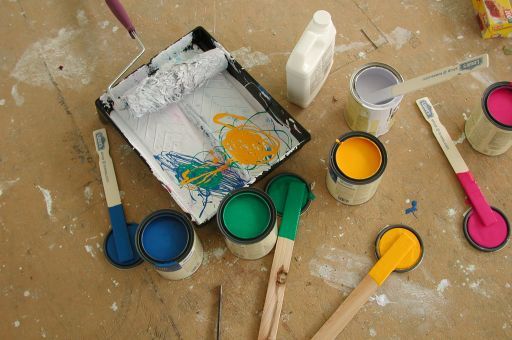 He then dispensed the most saturated version of each the machine would let him into quart cans I used whatever white or cream paint lying around as the base. The former owners left us all this half-broken stuff, but two things proved handy—miscellaneous cans of paints and a large wooden cutting board on rubber feet.