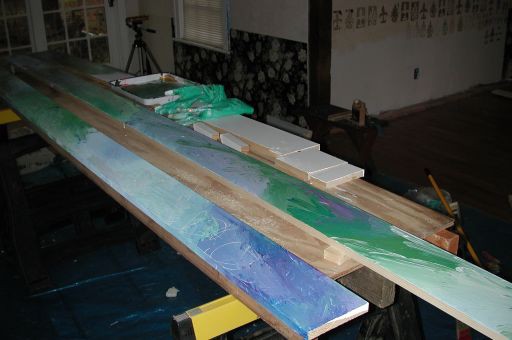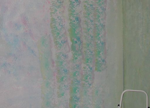 I probably put 20 (partial) coats on the studio walls, a process that took perhaps double the time standard painting would've and no more, (and probably quite a bit less) I'm convinced, that the careful approaches my sister and sister-in-law used, scrupulously following directions in books with newspaper (ragging off) and plastic wrap. However, my approach requires a little more operator input. —I did use newspapers on occasion to desaturate the roller if necessary.