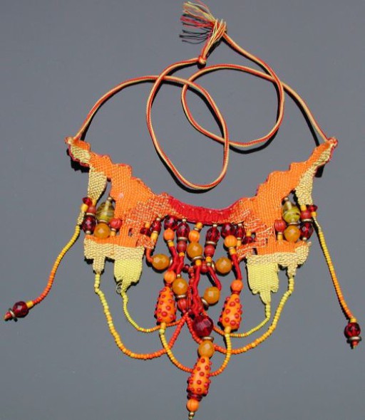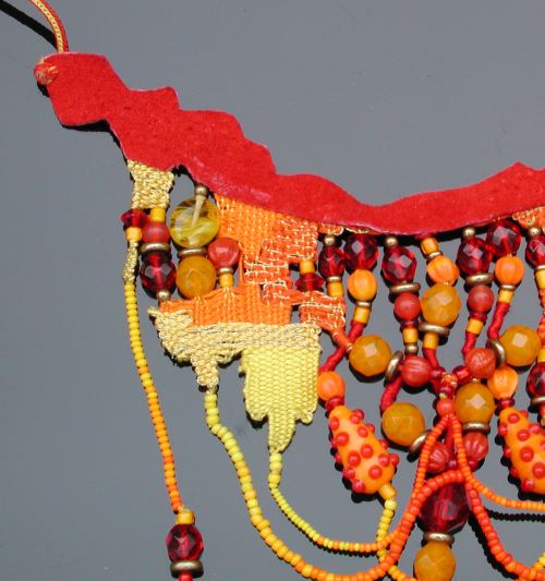 I thought taking a class would be easier, and that I could just get the teacher to tell me all the neat little tricks, instead of having to discover them for myself. Wrong. Though the teacher was an experienced textile artist, her knowledge of the technique dated to the same article I'd read, and after blindly following her well meant but somewhat uninformed advice, I proceeded to make some unjudicious design decisions (this is called “making mistakes” by beginning artists; and “pushing the envelope” by more confident ones). Determined to make this piece work, I learned a great deal about tapestry needleweaving's limitations. The weaving must be tight enough to support the weight of having beads strung on the warps. I didn't weave tightly enough, and the piece desparately needed extra support. I provided this by gluing some red suede to the back.