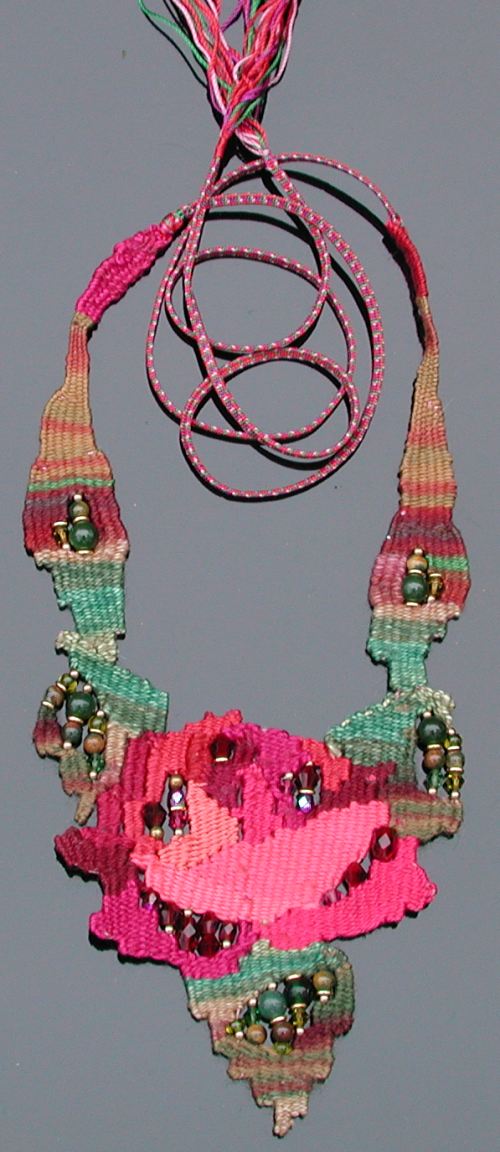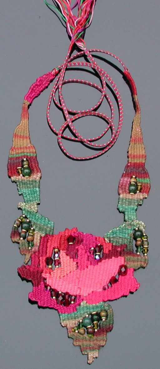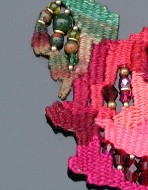 Anyone perusing these pages, which I do, in fact, consider to be the more successful of my pieces, cannot fail to be aware of the many problems. I thought the butterfly really worked well: the fibers made a pleasing combination of colors and textures (quite by accident, as many aren't ones I commonly used), which also reflected the pretty center bead; it gave a great focal point; and the piece really looks like a butterfly. So I decided to try again, with another favorite motif, a rose.