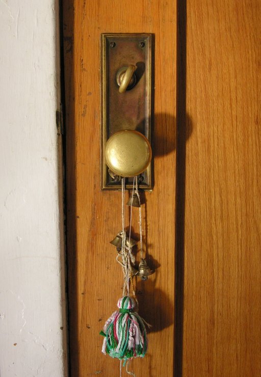one of several tassels decorating the house during the holidays. This one hangs from the front door along with some bells.