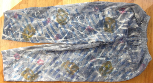 Although I think this pair of pants has the honor of being the first item listed in this series, they're actually nearly the most recent thing I've done. Although I've done a little dying starting with plain fabric, my most successful experiments, thus far, have been altering clothes, usually pants purchased at the local resale shop for a dollar or two—how can one mess that up? (Well, I can, but that's for a future post.) The existing color means I can start with the discharging step, for which I use bleach. I soon concluded that I want to buy that special thickening agent for bleach (I have the seaweed based stuff for dye) but in the meantime, I put some in a squirt bottle and had at it.