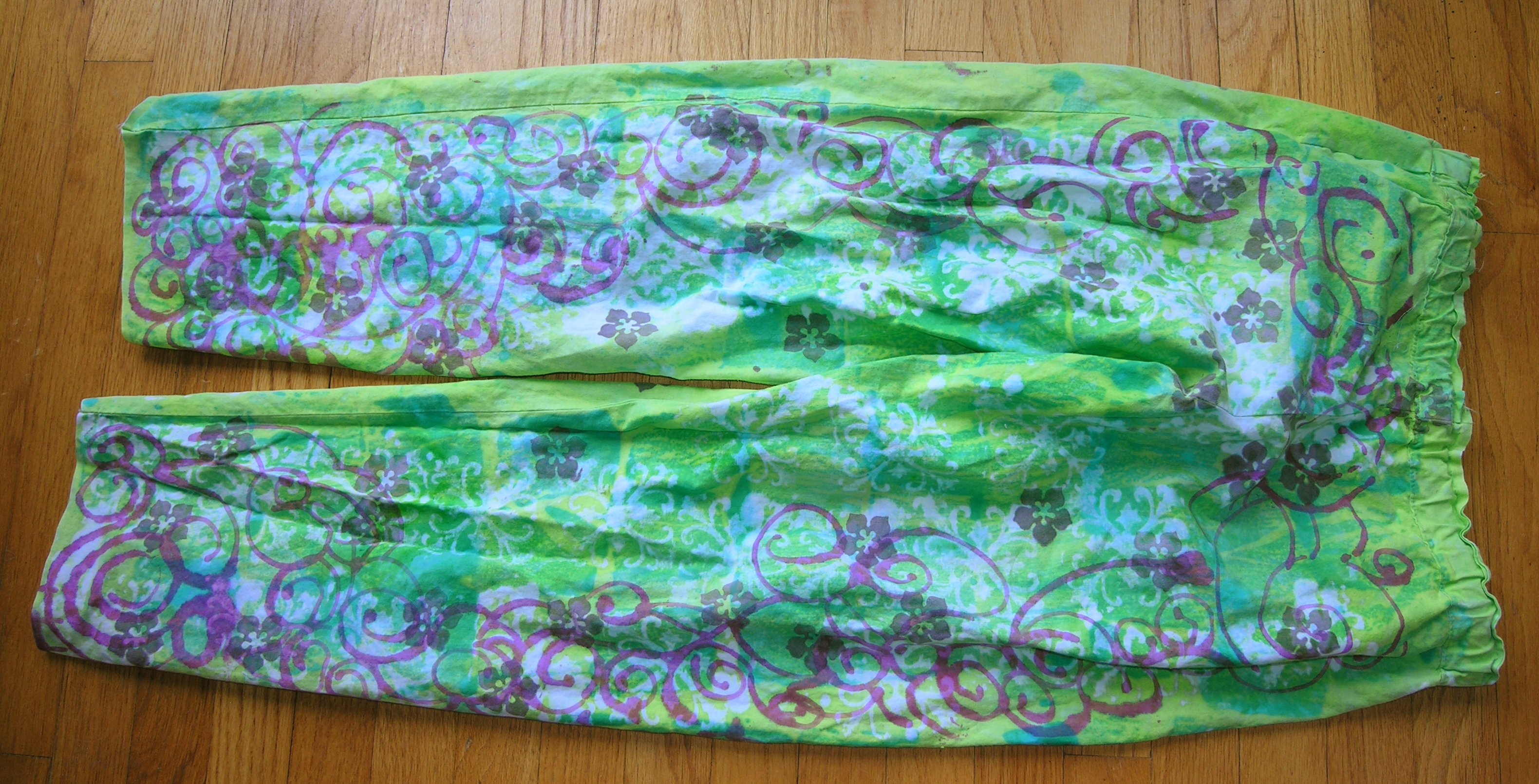 I used an old pair of pants that had worn out as the basis for my pattern, which wasn't altogether successful, as the fabric had become distorted with age. But I managed, however clumsily, to cobble a fairly comfortable pair of pants, and proceeded to decorate them. It's been months, but again, I think these were actually on of my earliest efforts (before the winter pants featured earlier) because the turquoise stamping didn't work out at all well, and henceforth I resolved to thicken the dye. (Obviously somewhere in there I overdyed ’em to a much more yellow green—perhaps that was the first step?)