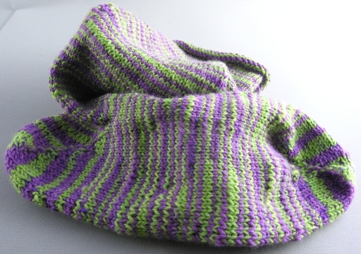 This yarn, lorna's laces 302 "Jungle Stripe" has a 32" repeat: that is, the hank stretched out 32" long, and is half green (a rather variegated green, actually, though alas, my photoflood died, so I can't photograph it) and half purple. So if I wanted longer stripes, say what I get on the heel, I would need, perhaps, a 64" repeat... of the 210 yds I used all but 83 to make my sock. My feet are 9.5 inches long (or perhaps 9-3/4, depending on the ruler), and 9 inches in diameter at their largest point, which means I supposedly have small feet and wear a 4–6 size shoe. Well, I've worn 8-1/2 for years, so I think there's some wacky going on here.