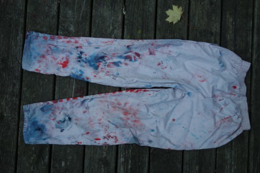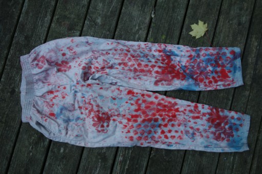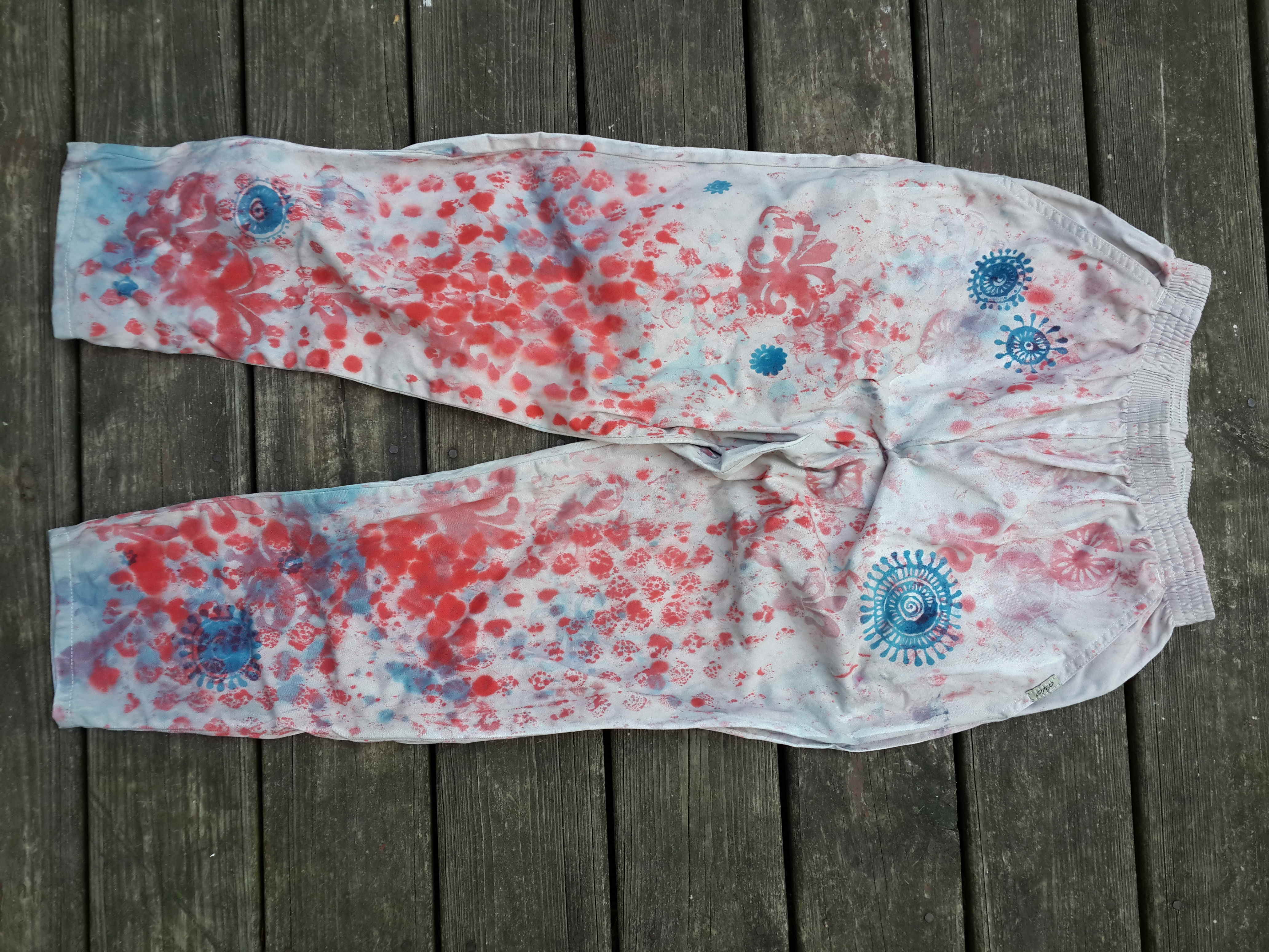 Last fall I got a whole bunch of light, neutrally coloured cotton pants from the local thrift shop, and dyed them with the colours I had the most of: namely cyan and scarlet, a dark prussian blue and an orangey based red. For this pair, I experimented with bubble pack as well as some commercial stamps to do the original dye job: