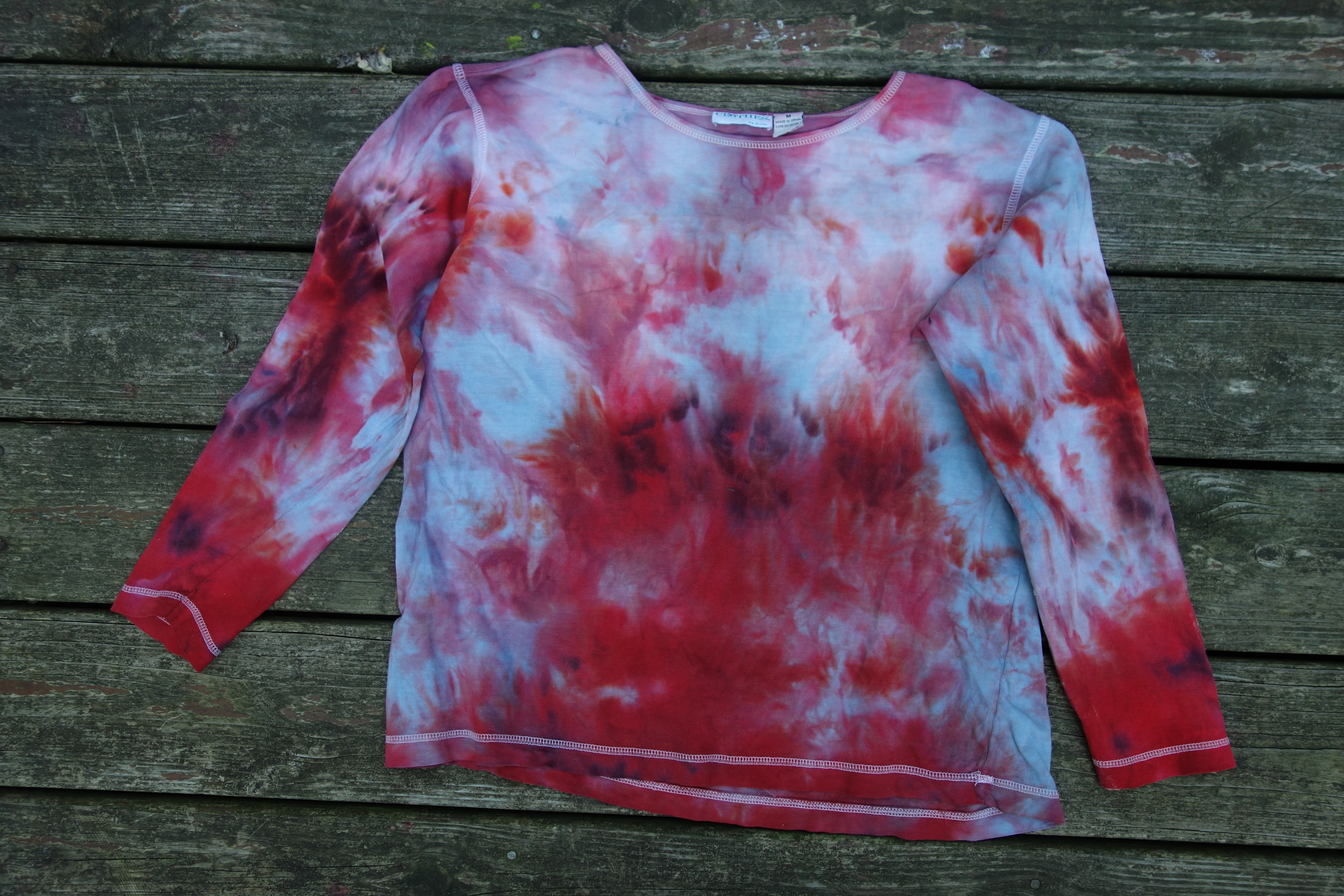 white cotton long sleeve shirt, dyed with scarlet & turquoise. N.b. click on the images for a high-resolution full-size version.