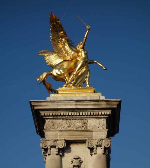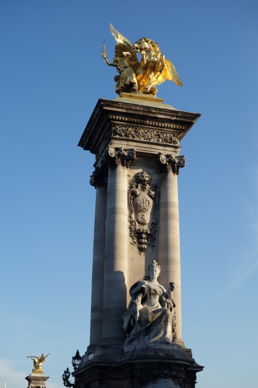 So I just loved these gilded sculptures in all their golden glory, and though my photography can't do justice to them, the lighting was darn near perfect, so I had that going for me, at least. They make up part of the ‘bridge of Alexander III’, dedicated to the Russian czar, with whom France had just signed a treaty. This most famous of Parisian bridges was within walking distance of Ile Saint-Louis, where we were lucky enough to stay, so I could and did walk over to it when I thought the light would be good—roughly 8:45 pm, if I set the clock on my camera correctly.