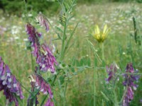 I'm slowly branching out from single, closeup shots of flowers to slightly larger views as this flowery meadow framed by vetch (probably cowvetch, another alien) and goats beard. I saw fields of vetch, hawkweed, daisies and others (sow-thistles, probably). Wonderful. Probably shot on the Old Wagon Trail, in one of the meadow clearings van Riper State park.