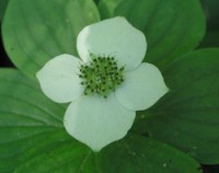 I photographed this pretty, large (3”) bunchberry on the little path that led from our campsite (No. 31) to the service road. If it reminds of flowering dogwood, it's for a good reason: they're related. Like the canada anemone, the white parts are actually bracts.