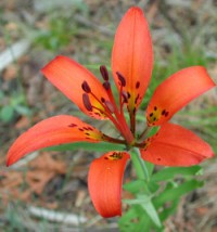 This is a native specimen of true lily, leopard spotted, and pretty dramatic, as it's some three inches or so across. I came across this bonus while on a hike to find blue flags and lady's slippers, both reputed to be abundent on the Hemlock trail, shortly before I reached the Weborg Marsh (where I hoped to see lady slippers) in Peninsular state park.