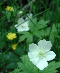 Canada Anemone, which we saw in the UP. (It also had Thimbleberries, and no lake for miles around.) Both the thimble weed and the canada anemone are in the anemone family; strictly speaking, those white things are sepals, not petals. Ranuculus, or buttercups, are in the background. Shot at van Riper.