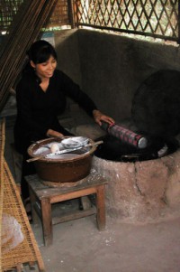 Similar in technique to Ethiopian injera or French crepes, the process is as follows: dip a small ladleful (perhaps 2 or 3 Tablespoons) of batter and pour onto a hot, flat pan (which shows poorly in the photo); roll up the resulting rice pancake off the pan with the cloth covered cylinder; then roll out the damp flatbread onto a woven bamboo drying rack. They're quite fragile at this point, and easily prone to wrinkling: it would be nearly impossible to remove them with a spatula. The smiling cook invited us to try making one.