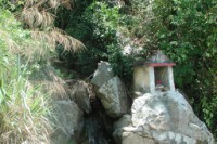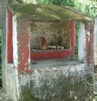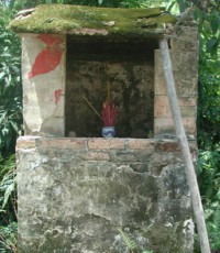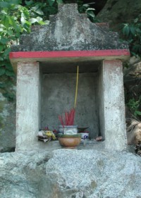 I was absolutely fascinated by these little roadshine shrines, and took many, many pictures of them. Offerings, so I was told, typically include up to five elements: incense (which you see here); light (i.e. candles); flowers; food; and money (real or not). Roadside shrines typically included incense and food, maybe flowers.