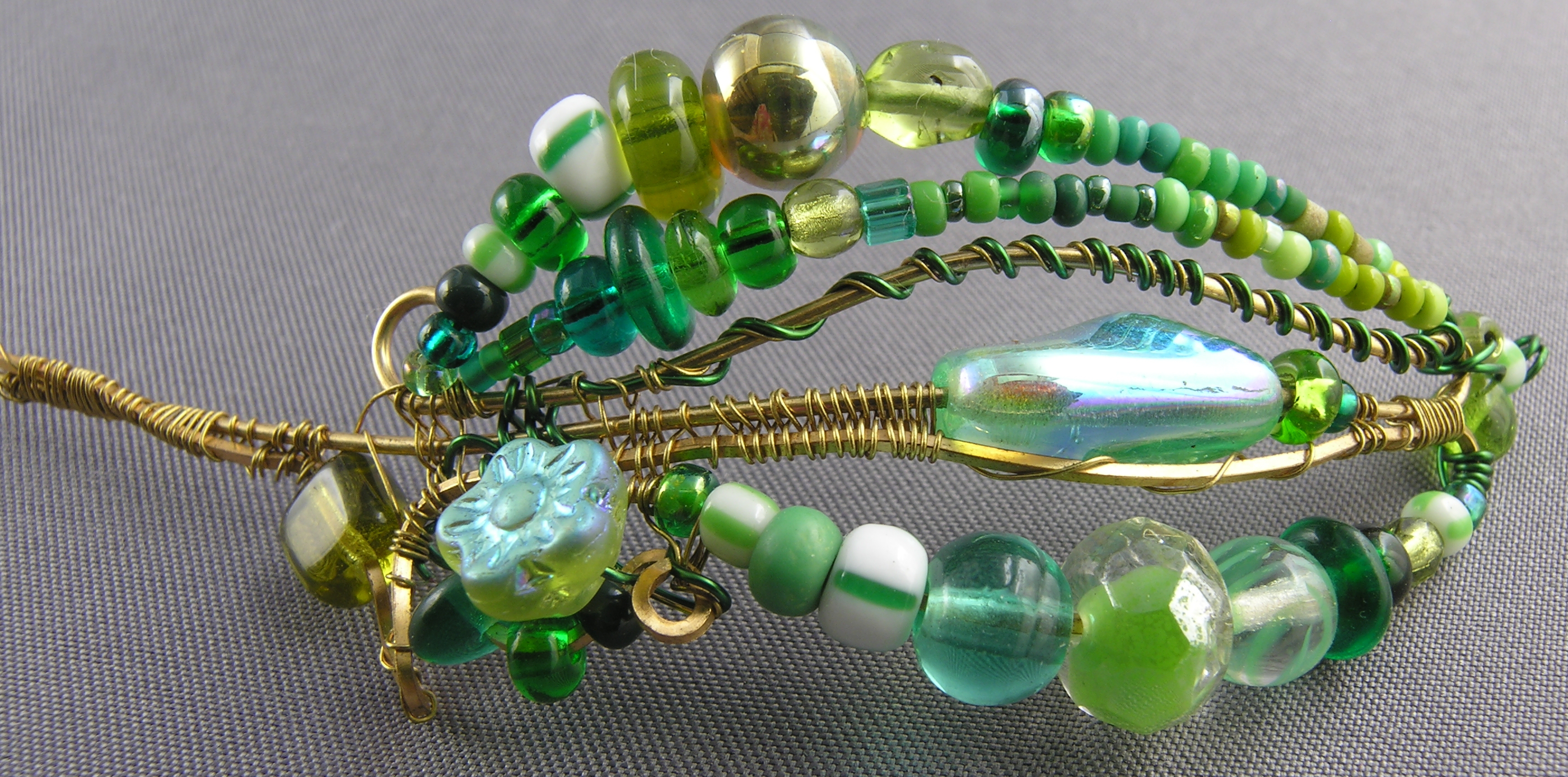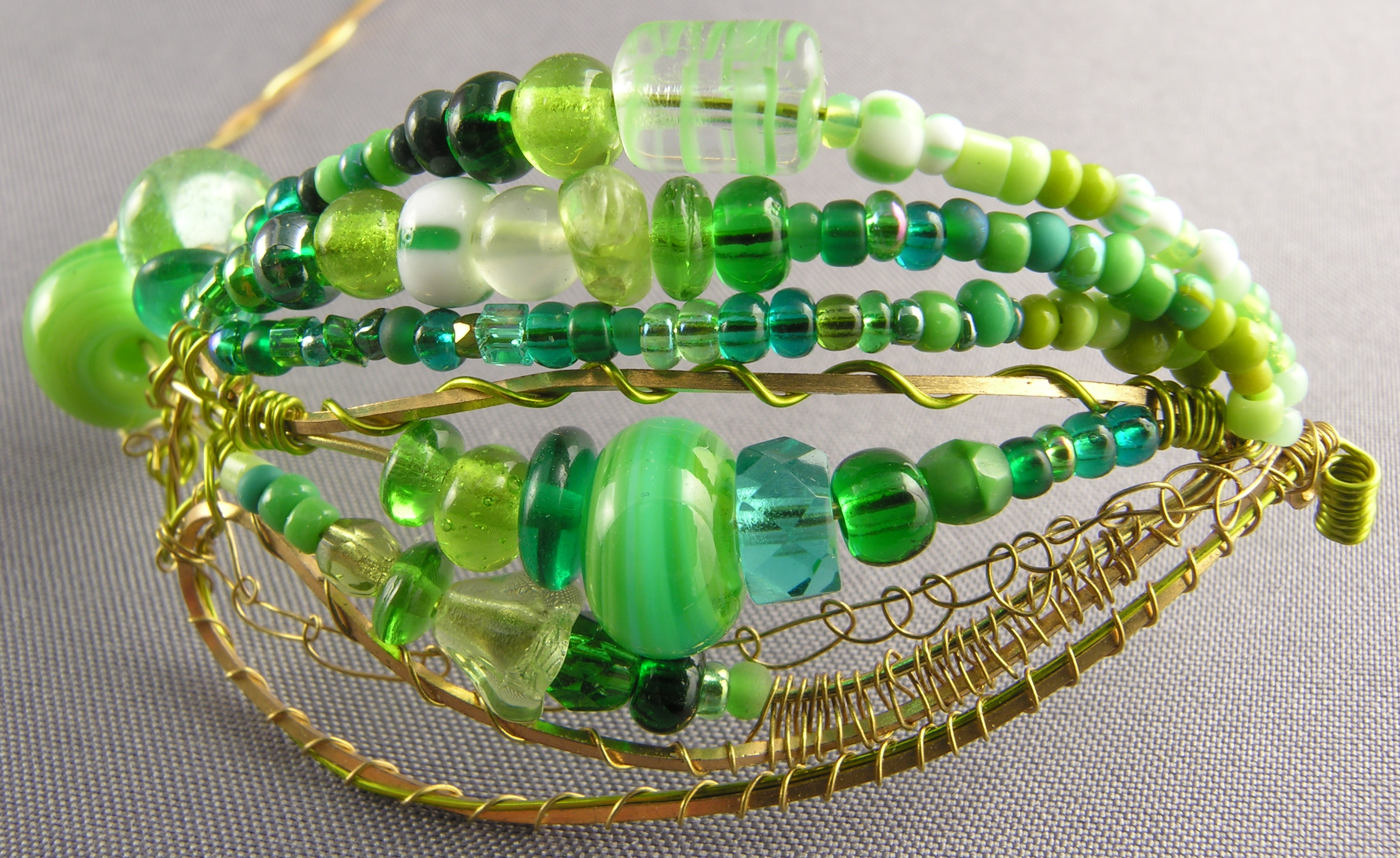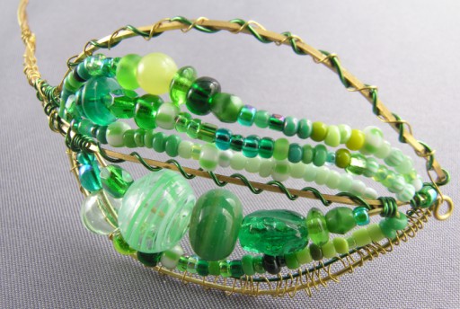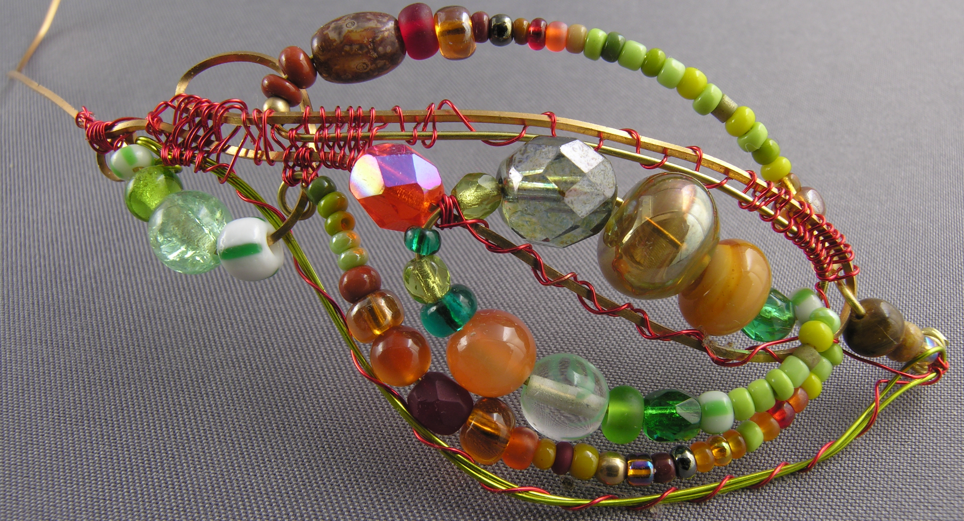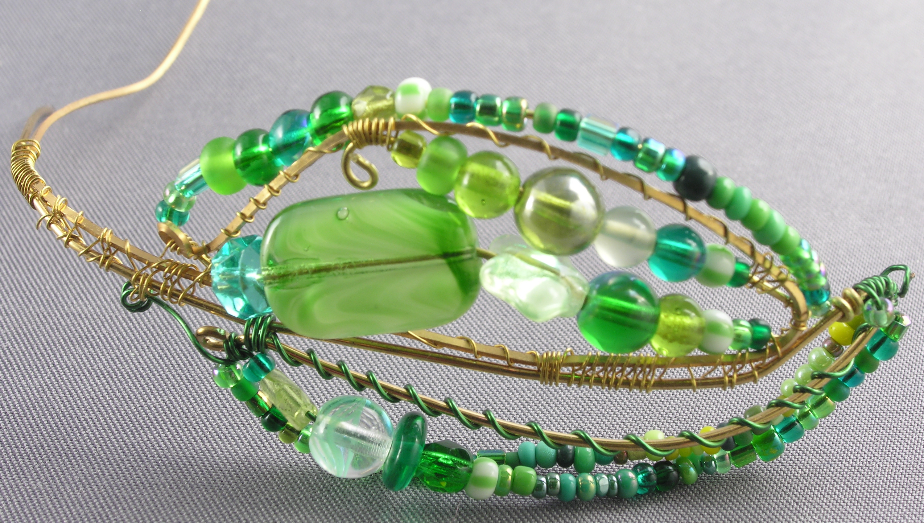 34x53mm, largest (artist made) 8x10 stripey hollow. Emerald green coated copper and brass wire, overall length, about 7”. Spring/summer 2008.