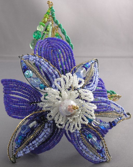 Even the fact that I failed to wind the ruff of loops tightly enough around the central bead could not dismay me. The mixed blue and white striped beads in the "fantasy" petals came out of a bead soup created by one of the kids years and years ago, and which I am still (sigh) sporadically using up. —That's why this series is currently blue, which is not the first color I'd naturally turn to, being more likely to choose either of its analogs, green and purple.