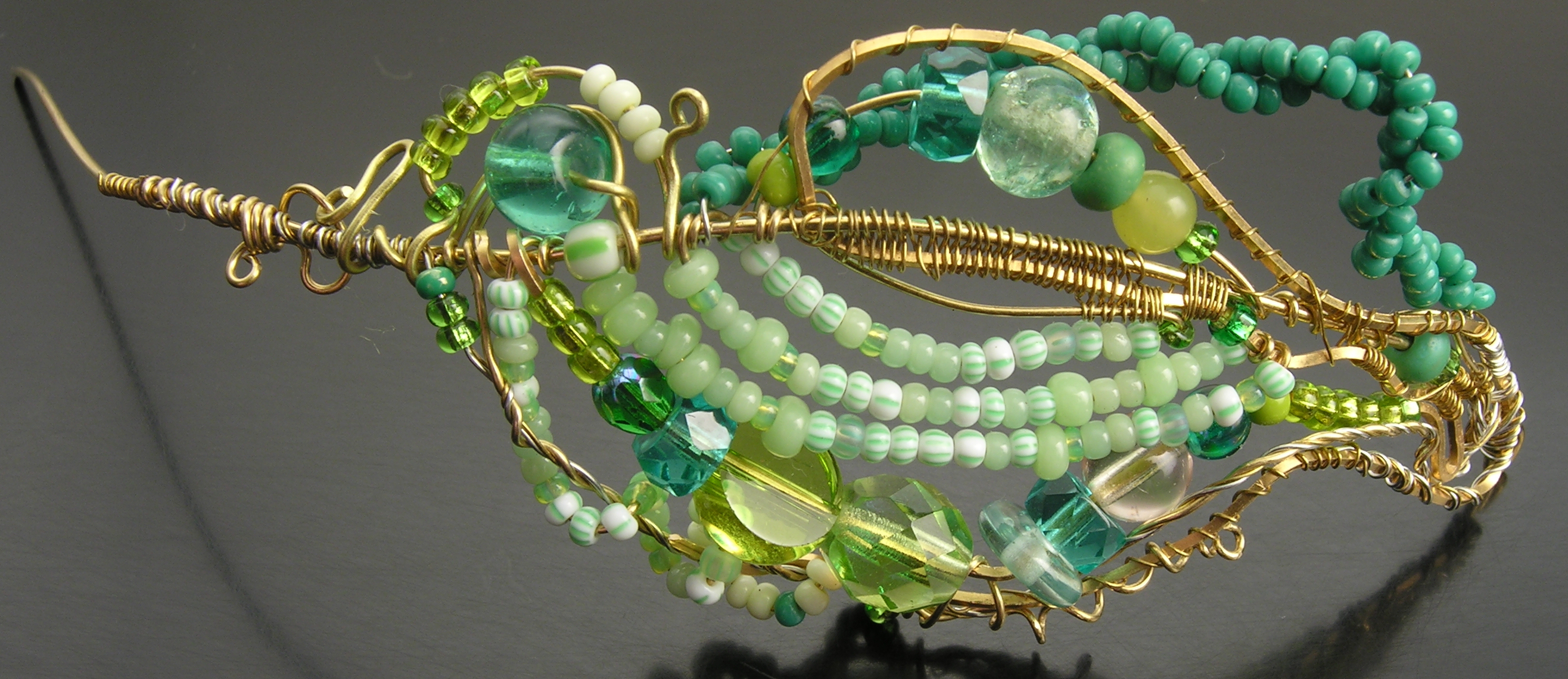 Wire and beaded fantasy leaf, 3-1/2" x 3” x 1”. Assorted base-metal wires ranging from 19 to 34 ga, glass beads (largest 6mm). April, 2008.