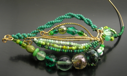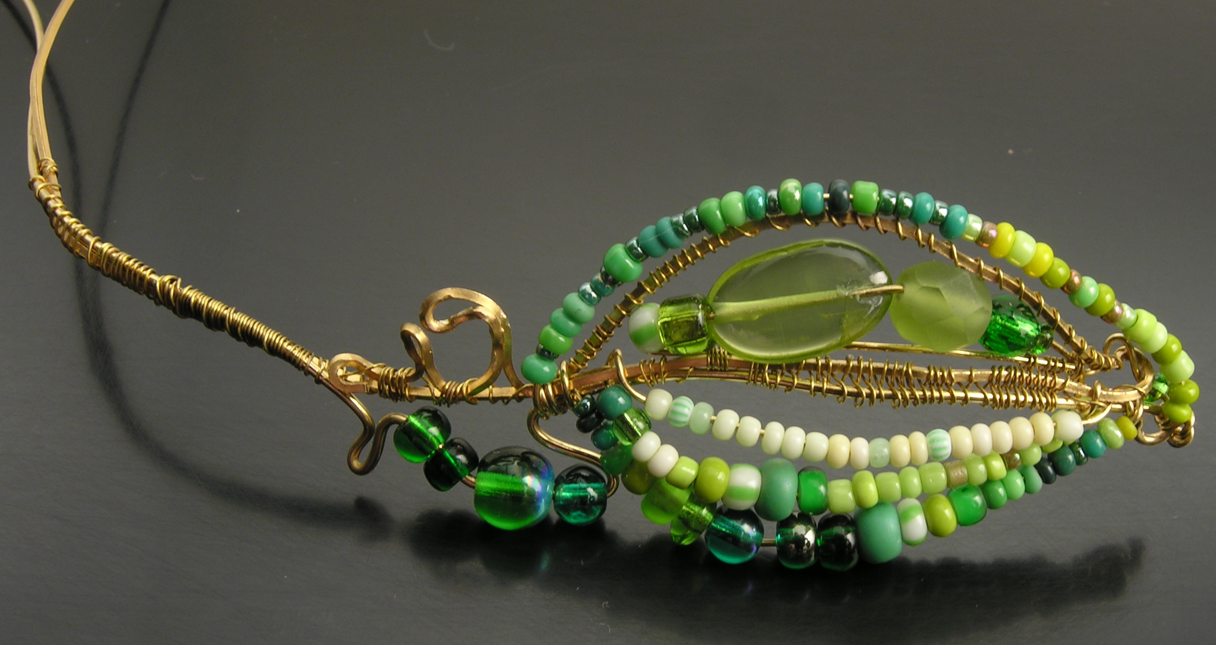 5" x 1" wide. Beaded portion 2" long. Assorted base-metal wires ranging from 19 to 34 ga, glass beads (longest is peridot, ~11mm.) April, 2008.
