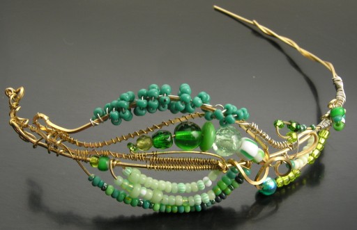 Wire and beaded fantasy leaf. 5” overall, beaded portion is 3”. Assorted base-metal wires ranging from 19 to 34 ga, glass beads (largest 8mm). April, 2008.