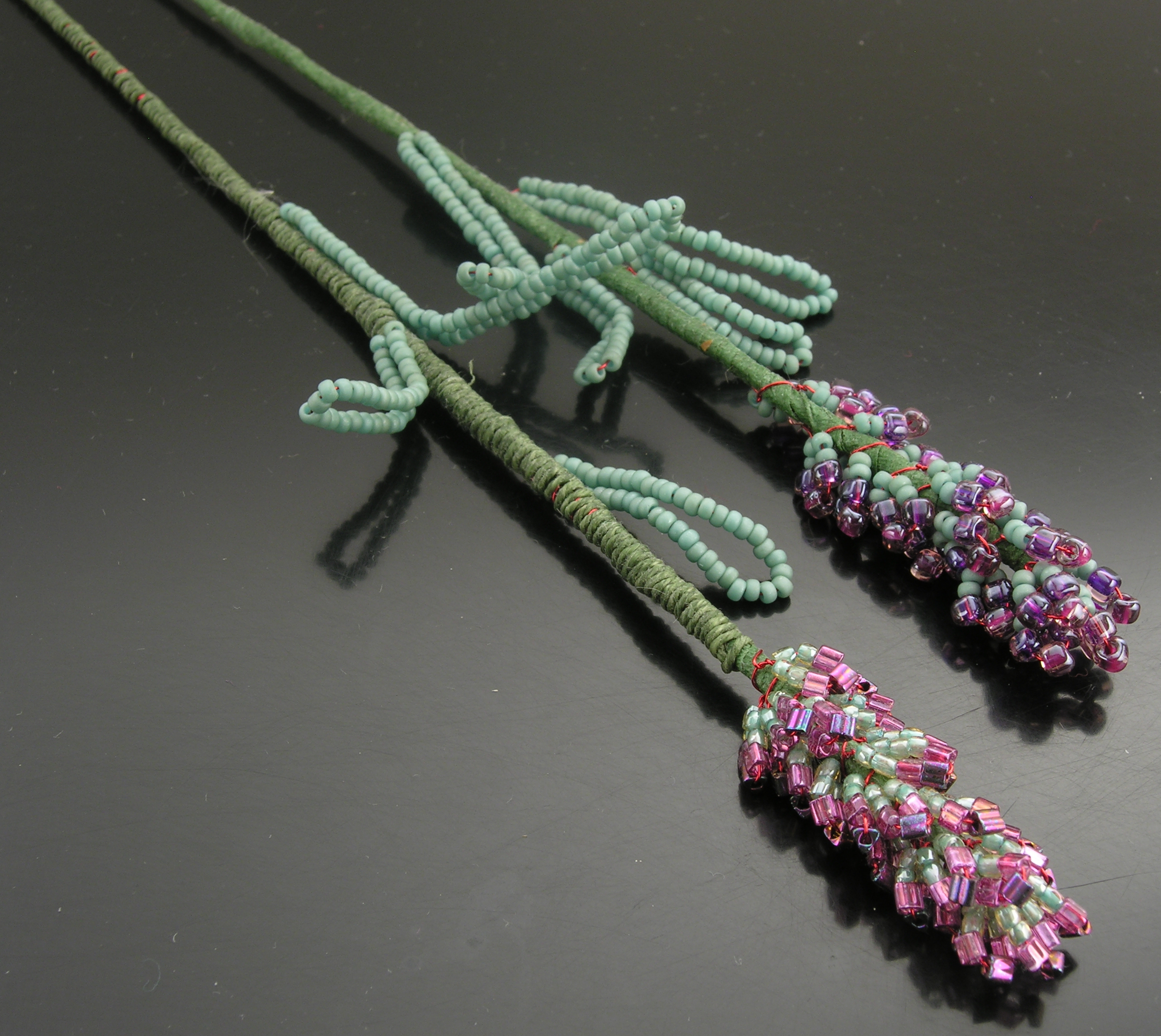 2 stems of lavender. Seed beads, triangles, 30 gauge red-coated copper wire, 9" 1/16" mandrels, floral tape and/or waxed linen. Overall length: 9". Flower length: 1-1/2 and 2". Completed April 2006.