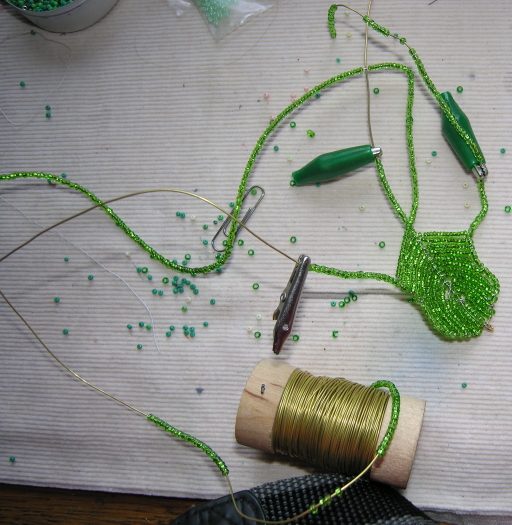 My first two efforts were truly dismal, and I used them on an equally dismal flower I made some time back. By the third leaf, I'd learned to not twist the edging together into the final leaf shape until I'd finished the infill (because it's difficult to predict how much space to leave for wrapping the infill wire, and no, jamming the beads tight on the wire is not the correct answer, unless you want to breaking a lot of beads with pliers). Leaving the beads loose on the wire didn't work so hot either, because these huge gaps developed between the edging beads. I learnt instead to use alligator clips to keep the edging beads snug, because I could move the alligator clips along the edging wire as I worked. The fill-in (28ga) wire wraps around the edging wire, then behind a bead and comes back from behind to start the next row: done correctly, the wire hardly shows, even in back.