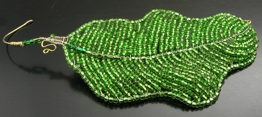 I inadvertantly bent the midrib to the left, and made some rows ever so slightly too long: but by curling the leaf downward, and stroking the rows upward, I created bends and dips that I think actually make the leaf more life-like. I was also helped by the fact that the two sizes of beads were excactly the same color, so they blend nicely. And finally, I managed to incorporate a little bit of wire-wrapping and curling on the leaf stem. This is something to explore further.