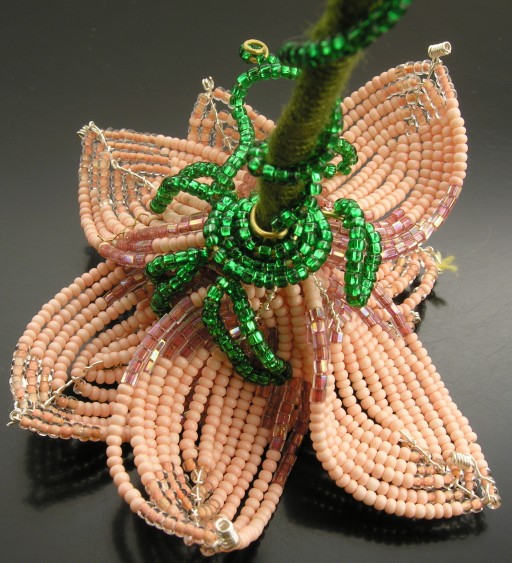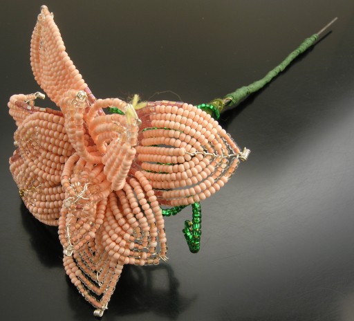 9-1/2” including stem. Flower measures 3-1/2" across at its widest point. Three colors of seed beads, silver and gold -color wire, fabric colored wire, mandrel. Completed march? 2008.