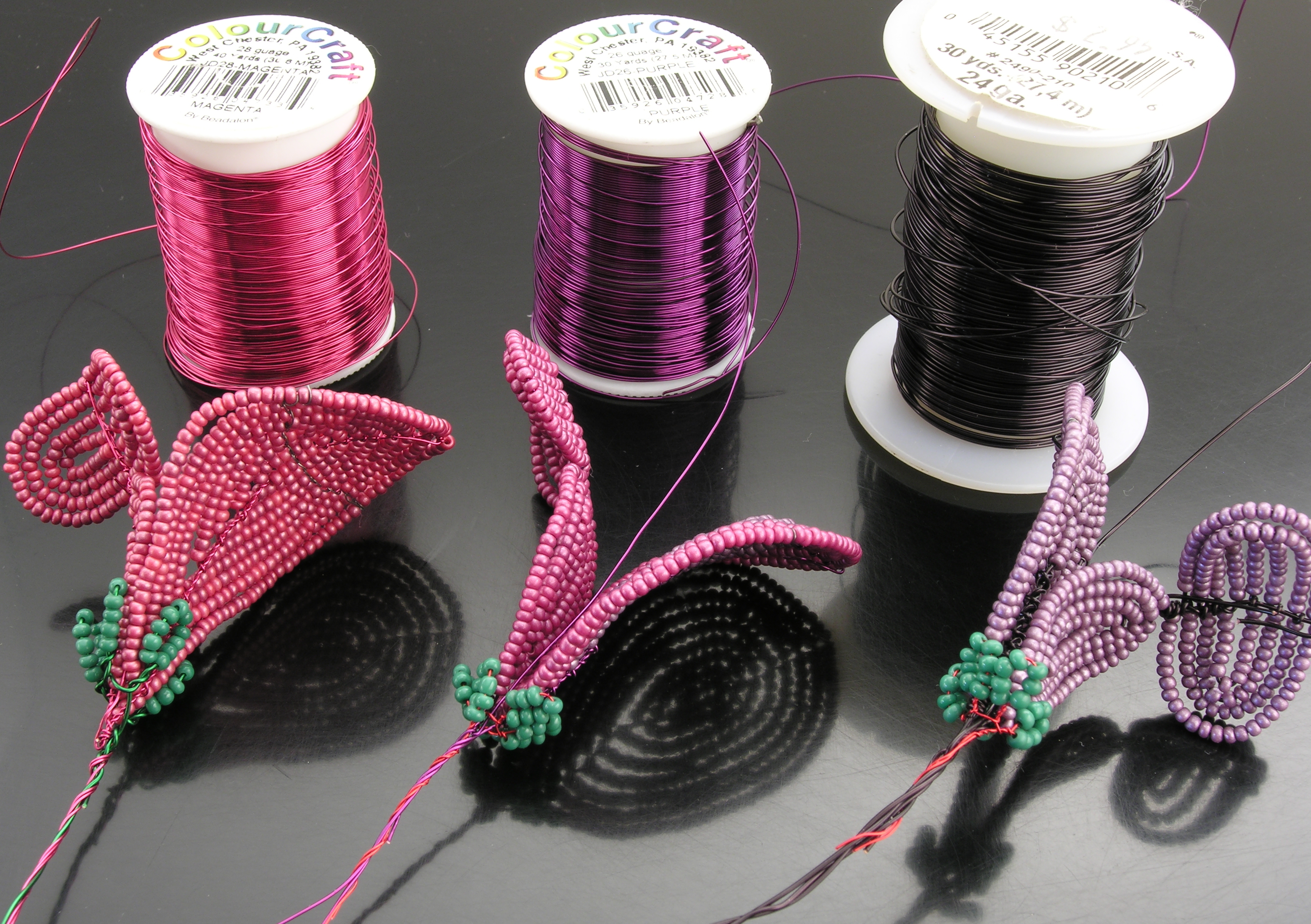 The 30 calices did not provide much support—just barely enough for purple, and not needed for black. But the magenta blossom was so floppy I made a 24 gauge calyx, with more beads (9 instead of 7) —obstensibly to make ‘leaves’ of calyx longer, but extra beads were taken up by greater thickness of wire. The heavier wire calyx actually serves to support blossom.