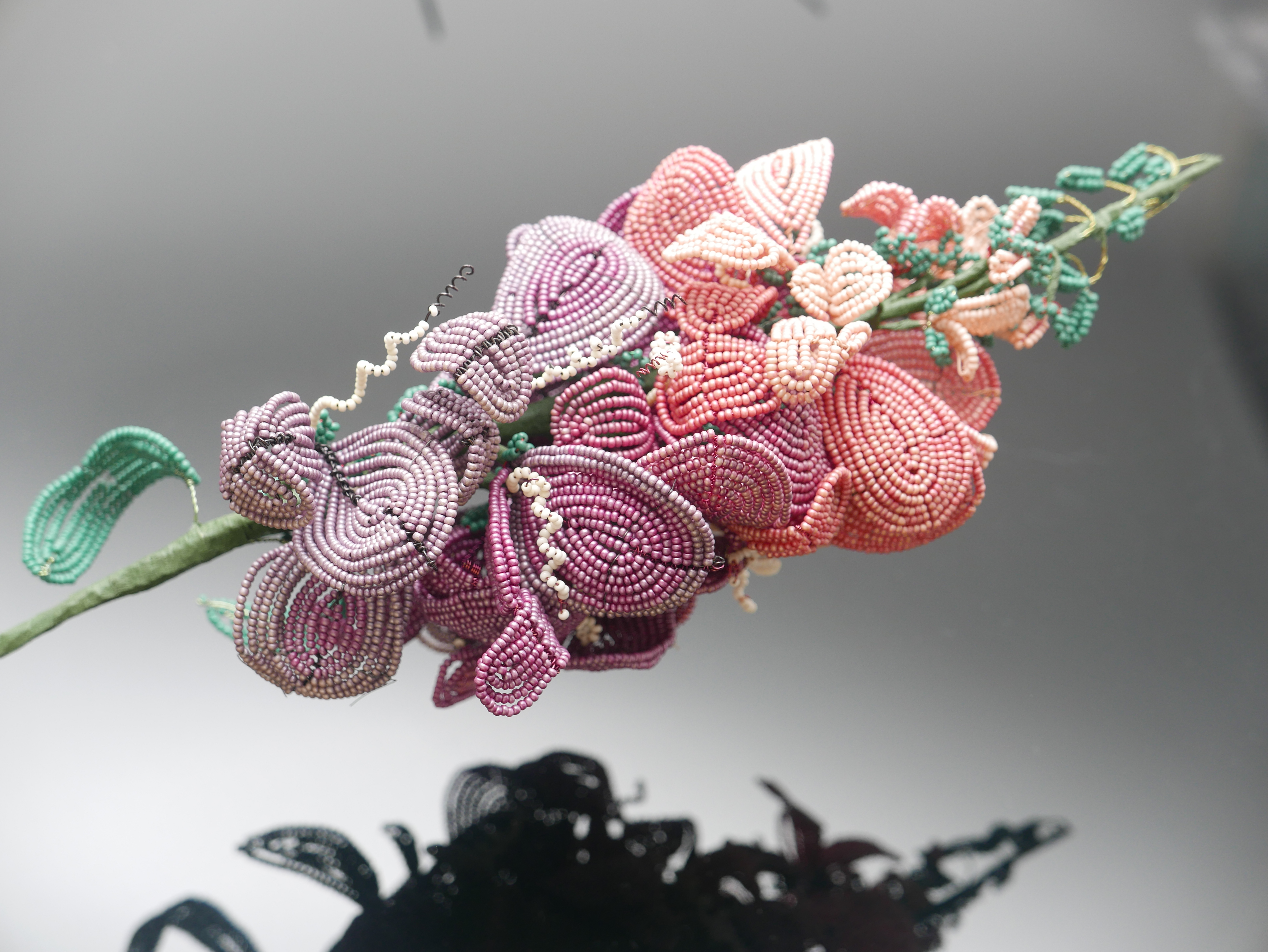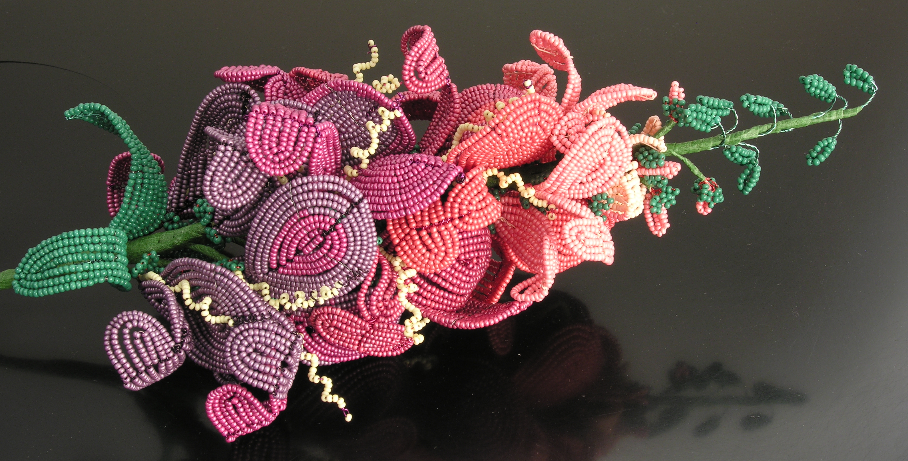 Snapdragon stem, spring 2008. Made with a lot of dyed czech beads, five kinds of wire (at least), bead mandrels, floral tape.