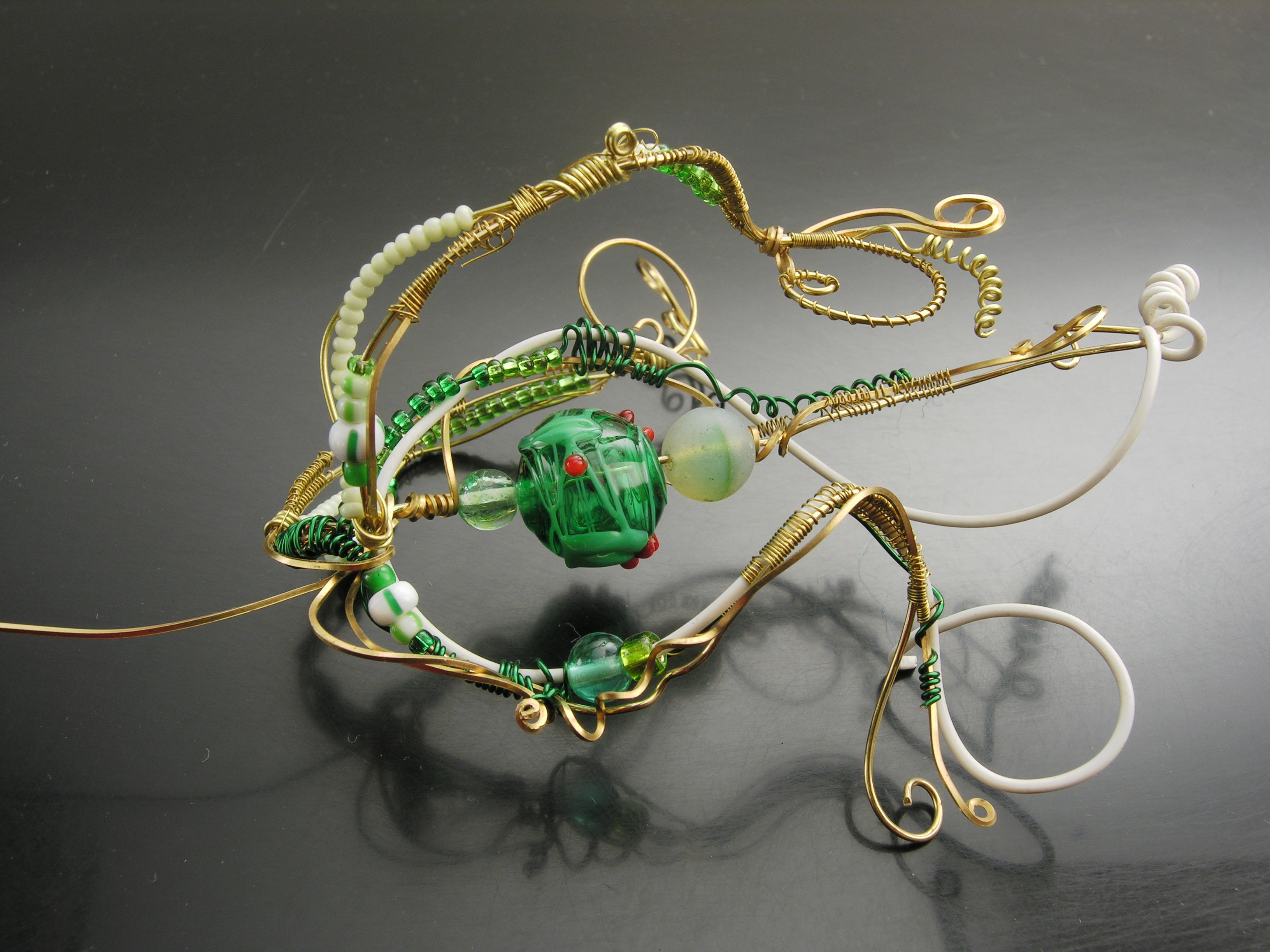 What I love best about this piece is the way the wire, particularly the ends, curl and twine—the white plastic wire seems especially lifelike. I like the different scales of the curls, the varying diameters and shapes of the wires. I like the way the 34 ga twines tightly, then more loosely, giving differing textural effects. Must find my coiling tool...