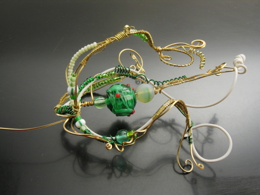 This is something of an interstitial piece, that I made to go in as a center for the fantasy beaded flower; but I made it too big to fit. Even making it I could tell it was ugly and awkward overall, but that it had bits and pieces of the idea I want to incorporate, somehow, into my french beading (which is basically just a wire-wrapping method, albeit one that doesn't show much wire). I mixed beads and wires before, as a glance at the wirewrap directory will show, but up till now I've come at it more from a wire-dominated approach. This piece has more of that flavor, excepting the subject matter, instead of being jewelry, is meant to be sculpture (which is technically what french beaded flower making is, not that most people would see it that way...)