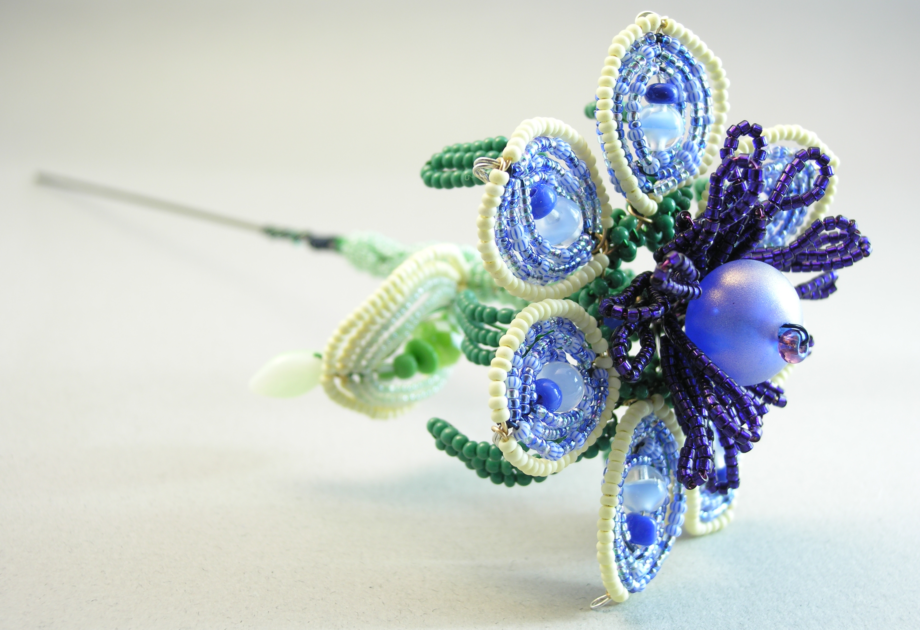French beaded flower. Completed 08feb09. 2-1/2 inches wide. Pixie center measures 15mm. Stem is 13" long. glass, wire.