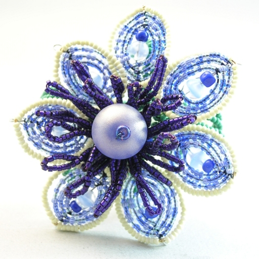 I also really like the way the pixie dust lampwork contrasts with the shiny silver-lined purple ruff, and how that in turn contrasts with mixed blue seed beads, which in turn are set off by slightly matte ivory...there are just so many possibilities when making these flowers.