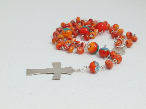 You can see the design for the cross is slightly different. I used what I call the ‘raked lotus’ pattern of filigrana blue and striking orange beads, which I quite like for the Our Father beads.