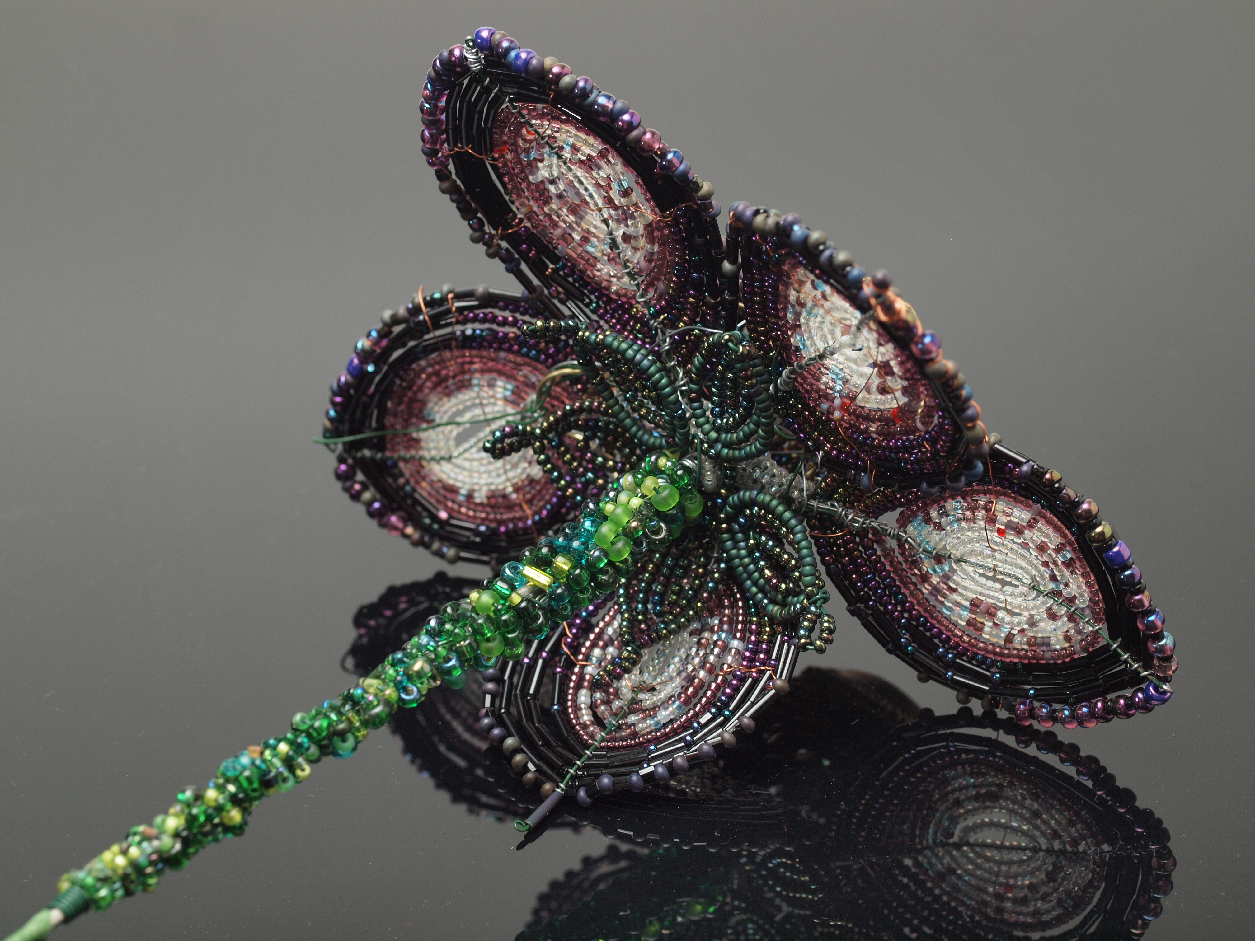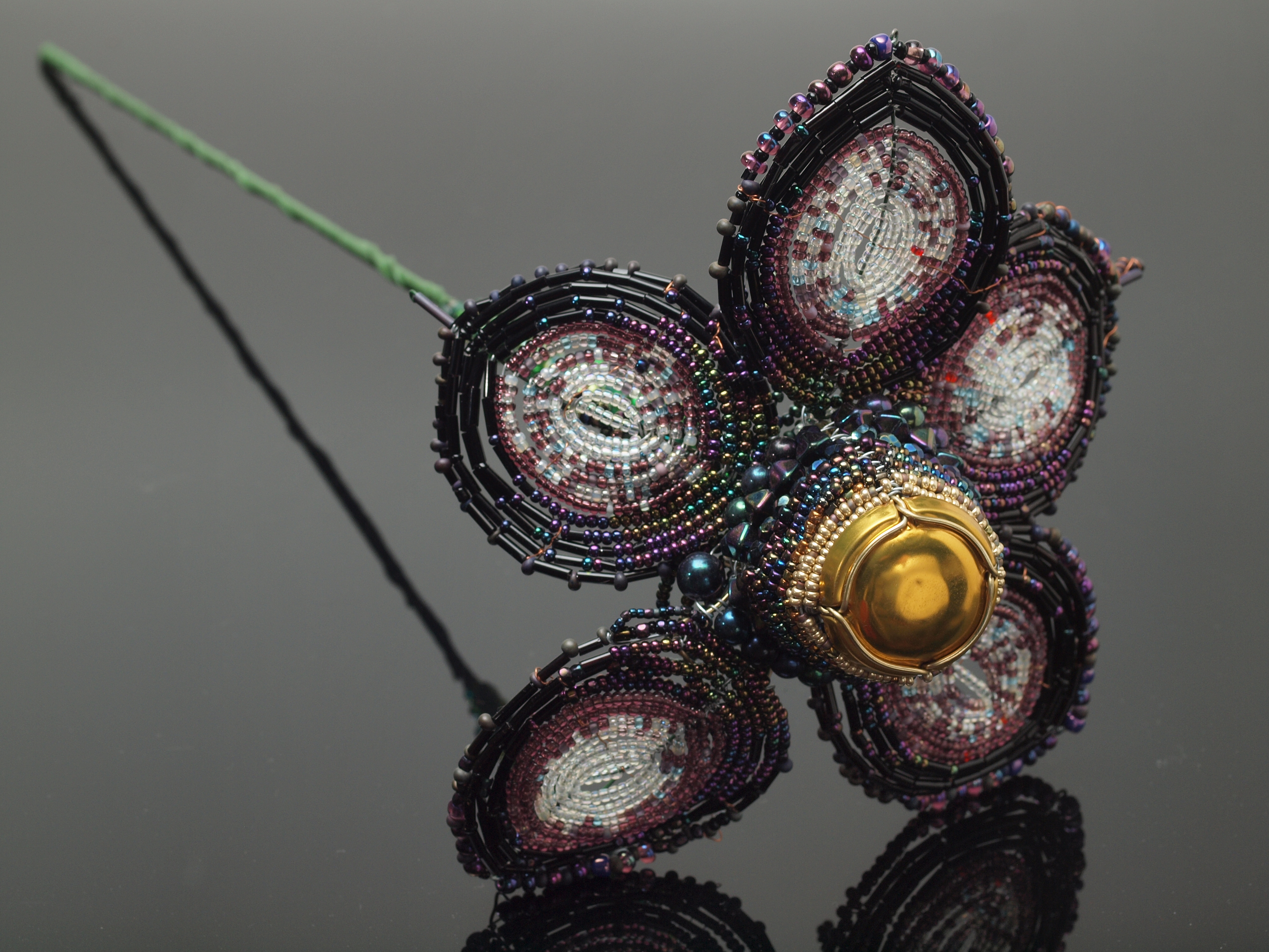 I just love the work of Mario Rivoli, which is distinguished by his incorporation of found objects and especially his visual colour mixing: seed beads, like the dots pointillist painters used in Post-Impressionism, lend themselves to this technique. In fact, with beads, you can take the process a step further, as beads can be transparent, opaque, translucent, reflective (i.e. with lustre or iris coatings), smooth or faceted, or even metallic: in that sense, each petal of a french beaded flower can be a tiny mosaic.