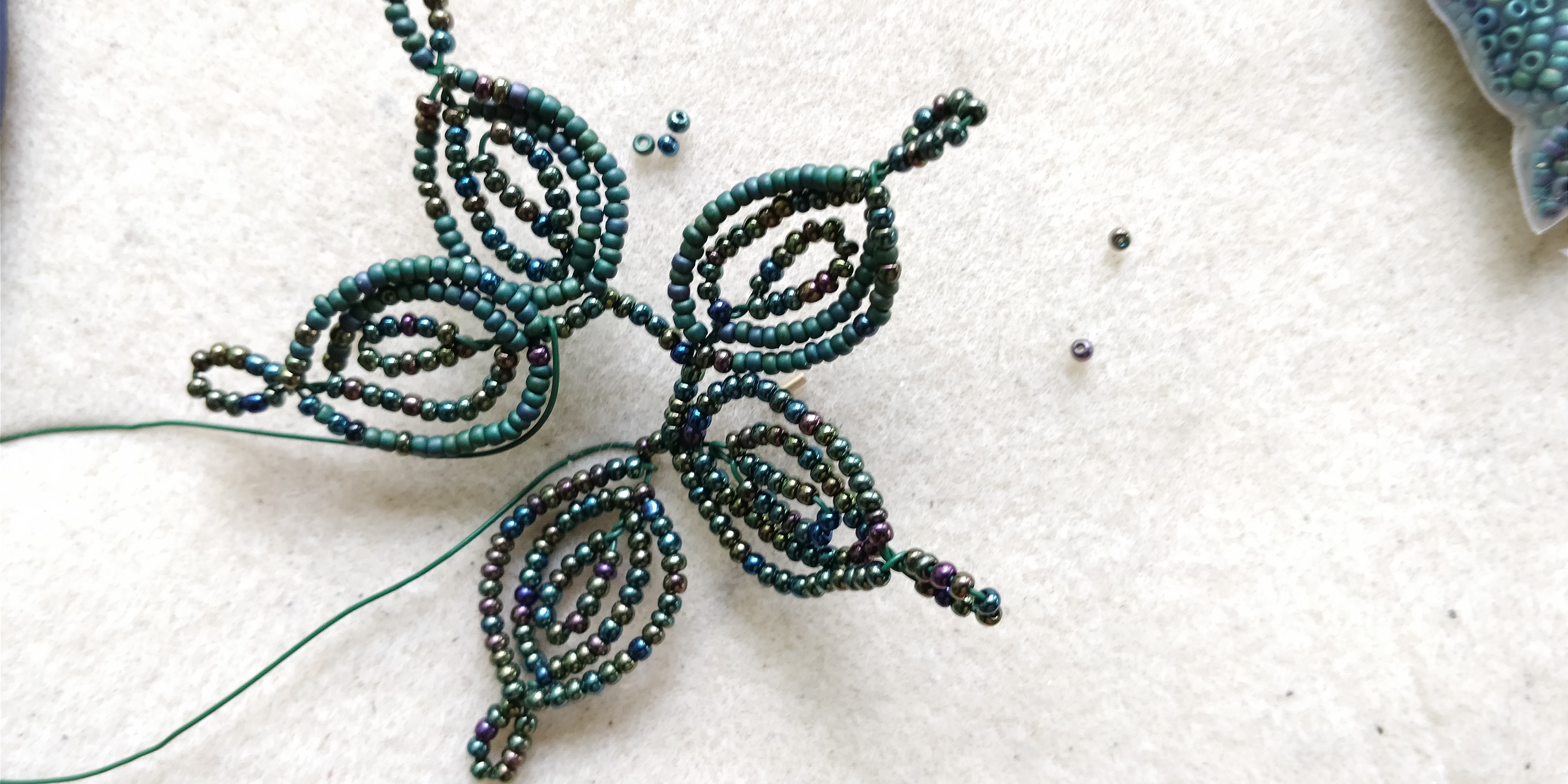 - make a second wrap around loop around the first, but twist a loop of about 10 beads at the tip of the sepal, leaving 1/8–1/4" bare twisted wire (that is, make a picot loop at the tip);
