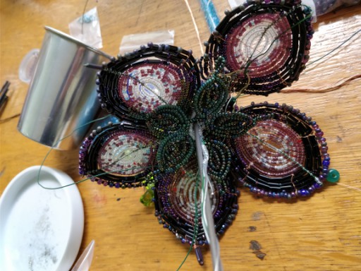 I had some roadkill—that is, colouristically mixed—seed beads that had been traded...why yes, I do trade people's leftover seed beads for lampwork:)[1] ; but I also have this desire to tidy and use stuff up, and rattier or less ‘good’ it is, generally the greater desire to get it out of the way. Using up roadkill is delightful, then I don't have to sink a lot of time sorting beads before they're ‘useful’. I also have a lot of iris beads and black bugles. Those would make a nice edging, right? On they went. I also tried incorporating some matte iris magatamas drop beads as petal frills, but wasn't that thrilled, so only did that on one or two petals. Because I used a variation of the continuous frame method to make the petals, the petioles were (widely) differing lengths, so I made some nice big sepals to hide that. Definitely a learning process, so this is only one of the more obvious kluges going on.