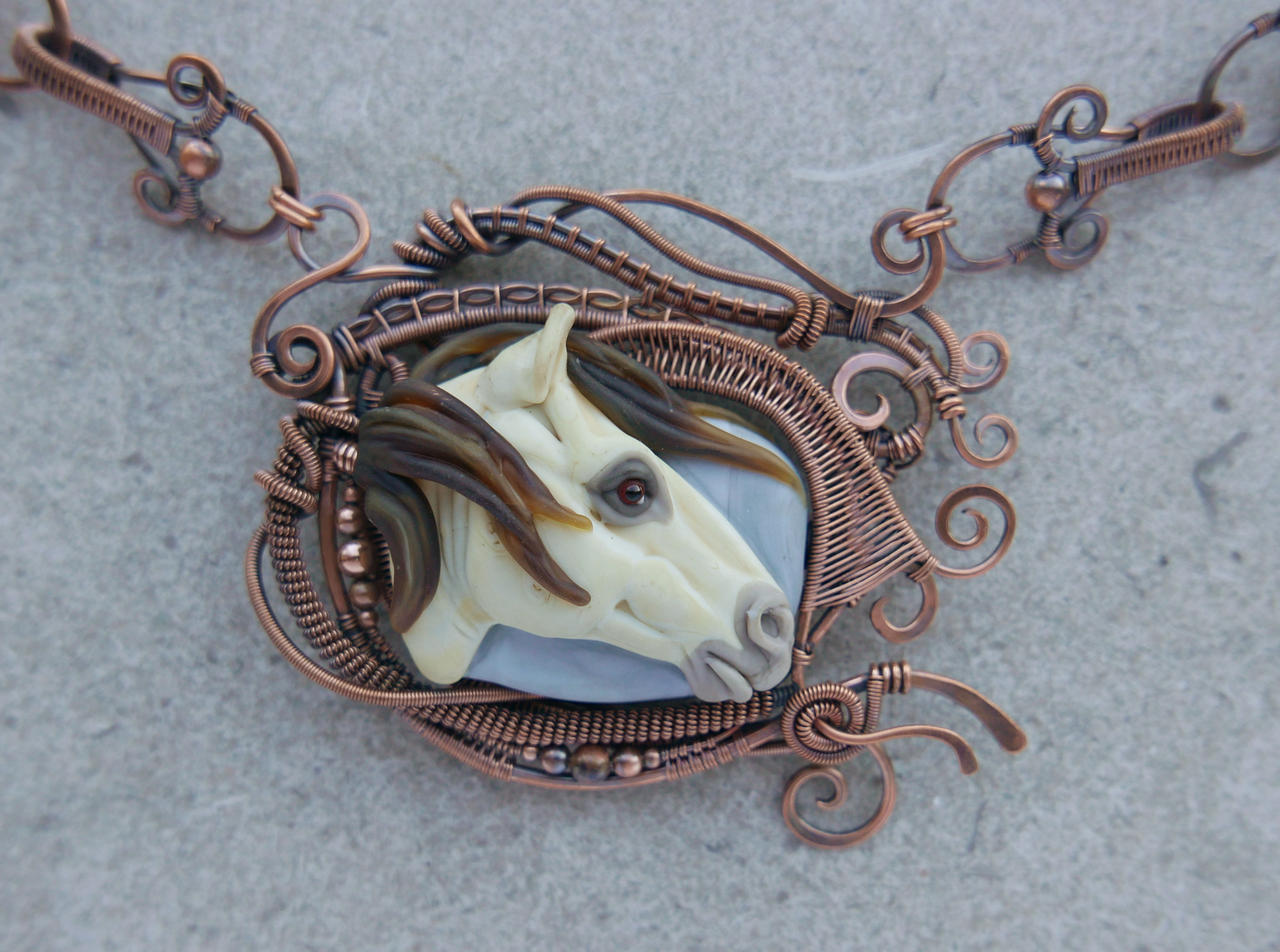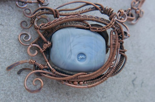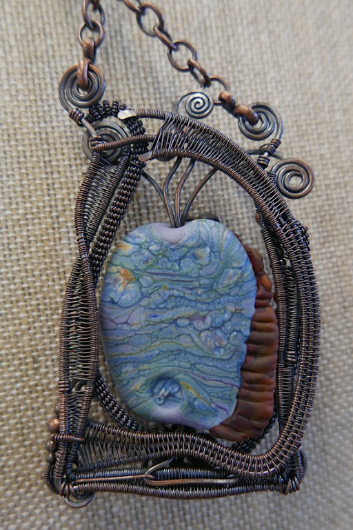 Taken with the lumix, color-corrected, cropped, sharpened. Bead by Joy Munshower of assorted 104 soft/soda-lime glass; copper wirework by Maria Richmond. 2018.