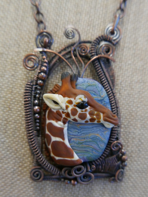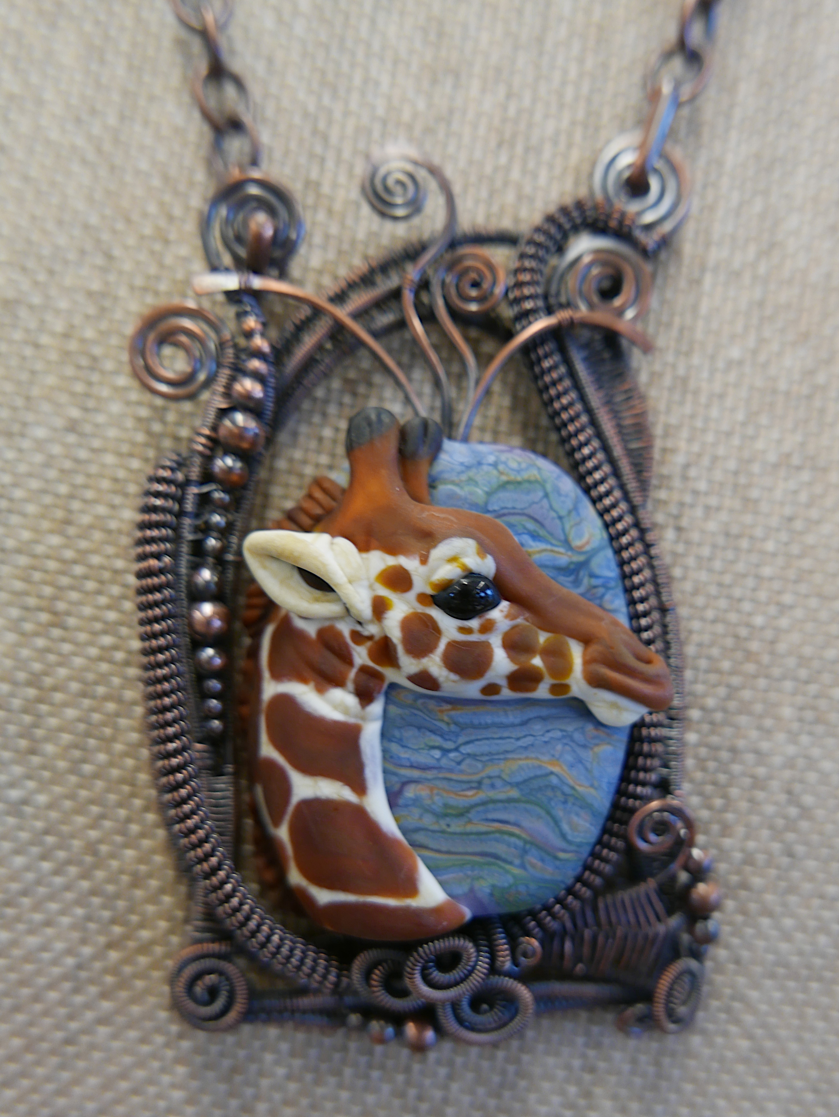 Munshower is known primarily for her equids, but she does great giraffes too; note how Richmond implies the animal's horns with the curliques spouting from the top hole of the bead, a nice bit of whimsy: