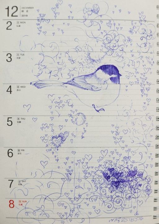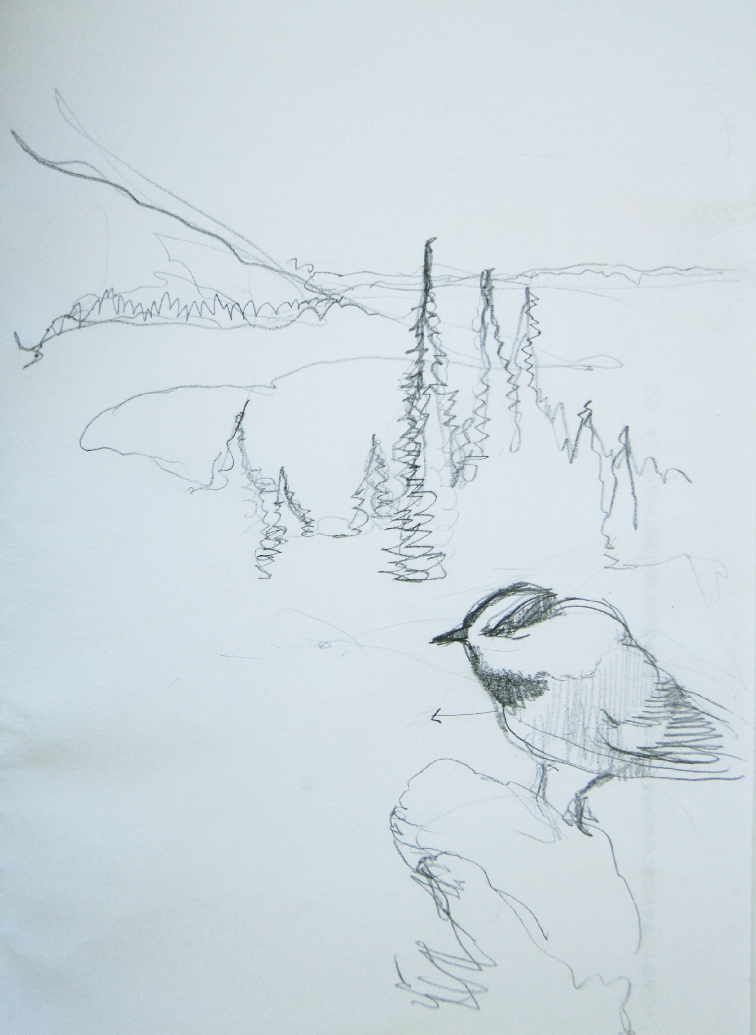A chickadee doodle made while working on this project. You can see the influence of this drawing especially in the curve of the tail in the bead. The heart-doodle motif dates back to my college days—it's a fun little shape, and, in this case, very apropos.