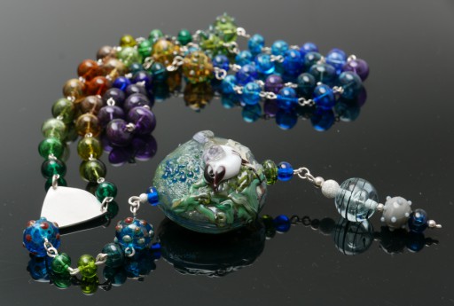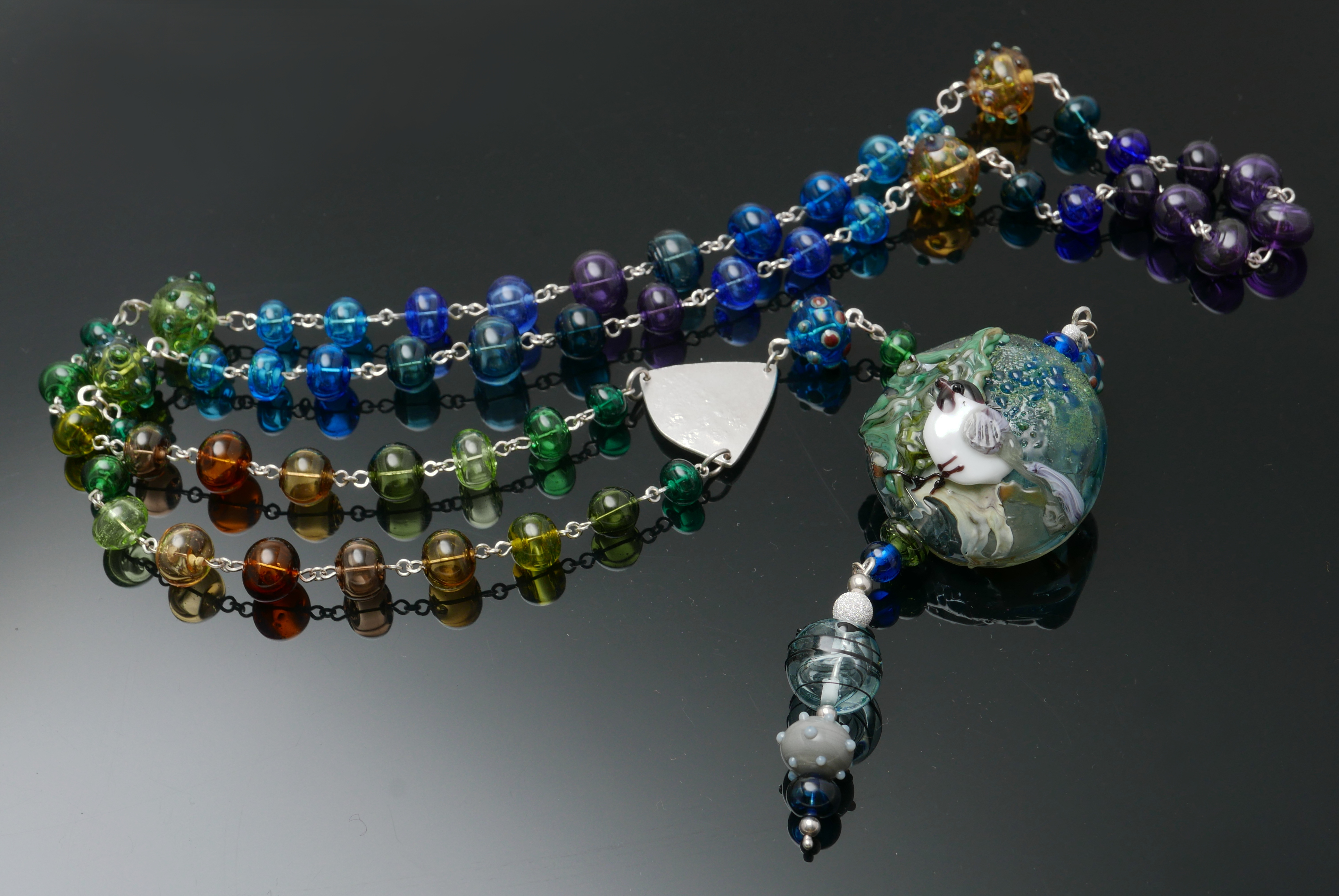 Glass, sterling silver. Beads made by sylvus tarn & Frances Ross. Frit, powder, trailing. 23feb2021, 1/30s, f/8.0, ev +1.0 ISO 200, panasonic DMC-LX100; cropped, some dust cloned out