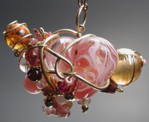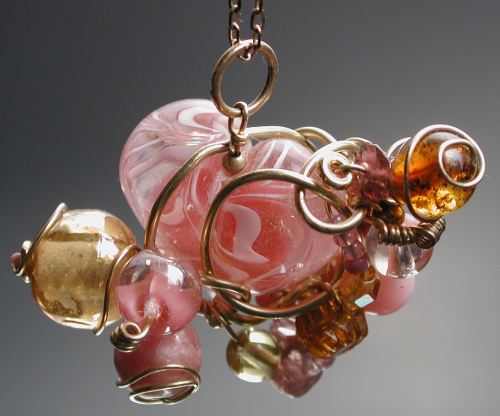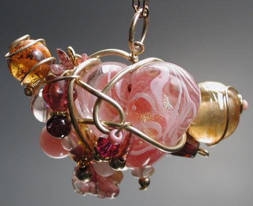 Austrian crystal, czech fire polish, indian mandrel wound, amber, tourmaline, garnet, rose quartz, rhodochrosite, gold fill wire all around one of Peggy's dichro core filligrana lampworked hearts. Mid 90s? Collection of the artist.