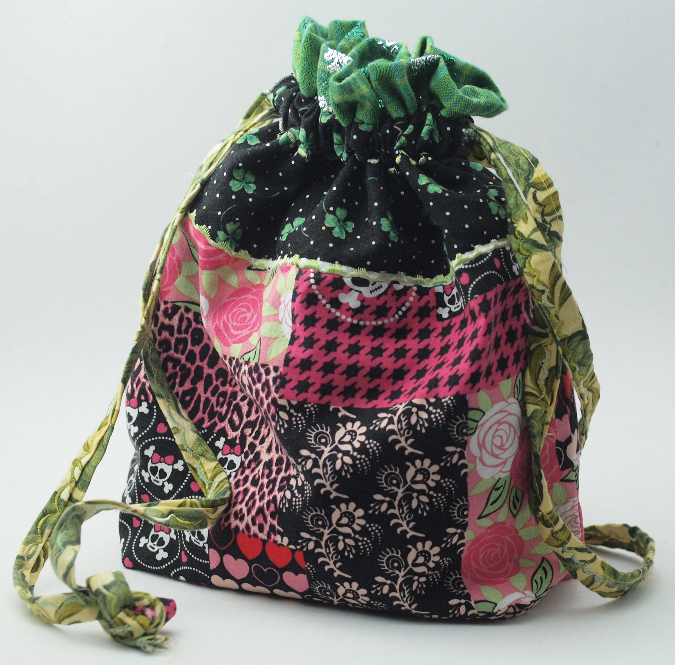 My family hated it. There are three fabrics in the body of the bag (plus the drawstring): the green lip, the black with green shamrocks, and the pink print, which looks like a patchwork of several fabrics, but just is printed that way. I, personally thought the yellow green drawstring, a hem I cut off some curtains, gave it some zip, but f2tE and the wizard did not agree with this assessment.